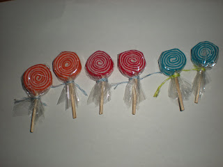 Hola mundo, hoy aprovecho para mostraros un elemento decorativo que he creado con fieltro, unas ricas piruletas, el modo de hacerlas es muy sencillo, en este caso dos tiras de fieltro que se van enrollando sobre si misma , yo a la terminación la doy una par de puntadas, y con un poco de silicona caliente le añado un palito, para los mismos he usado pinchos de barbacoa de madera cortados de una misma dimensión, a que es sencillo!!